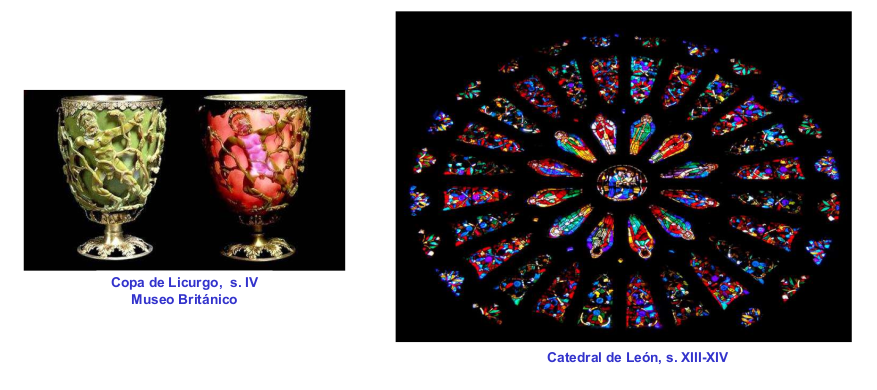 – las vidrieras de la Catedral de León (siglos XIII – XIV) solo muestran sus magníficos colores al interior de la catedral, cuando son atravesados por la luz. Esto se debe a la presencia de nanopartículas de materiales inorgánicos, como el oro o la plata. Lo mismo ocurre en la Copa de Licurgo que al iluminarla desde el exterior aparece de un tono gris verdoso y al iluminarla desde adentro, de un intenso color rojo.