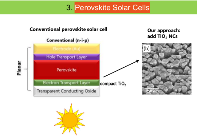 En la imagen se muestra una célula convencional: la luz del sol atraviesa las distintas capas convirtiéndose en electricidad. A la izquierda la perovskita se apoya en una capa compacta de titanio (una superficie lisa). El recuadro ampliado muestra cómo se puede mejorar este dispositivo si se recubre la capa de titanio con nanocristales, transformando la superficie en porosa (completamente infiltrada por la capa de perovskita); lo que permite una mayor interacción entre los electrones de la perovskita y el titanio. Pero, si en lugar de nanocristales depositados en forma aleatoria, se disponen en nanocolumnas las ventajas son varias, entre otras: