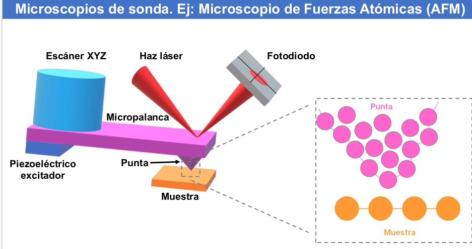 – microscopio de fuerzas atómicas. Ya no arrojamos luz ni electrones a la muestra sino que la “tocamos” con una sonda de punta tan afilada que es capaz de alcanzar una distancia atómica a la muestra. Como si pudiéramos sentir su superficie a nivel nanométrico.