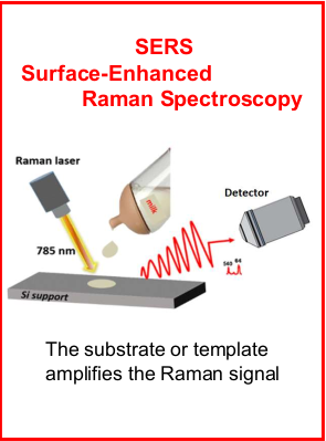 El esquema ilustra cómo el láser excita la muestra y las señales que esta emite son captadas por el detector. Pero, lo que permite la identificación de moléculas a concentraciones bajísimas (en el régimen nanomolar: una parte en mil millones) es el sustrato revestido de láminas nanocolumnares (generalmente de oro o plata). Si no hubiera nanoestructura solo 1 fotón de cada diez millones interactuaría (ganando o perdiendo energía) con la muestra, lo que sería muy difícil de detectar. Con la lámina nanocolumnar se consigue concentrar la luz en unas zonas específicas, llamados hotspots o puntos calientes, lo que hace que aumente la interacción con las moléculas colocadas en ellos y se logra que la señal se amplifique muchísimo (factores multiplicadores de mil millones.)