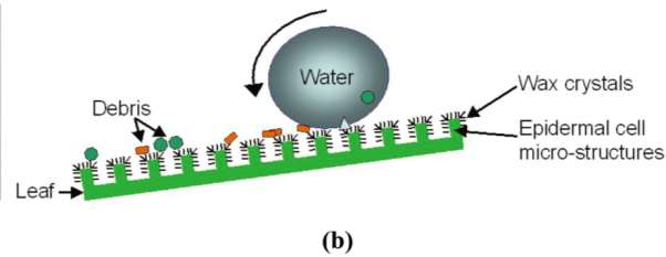 – otra forma de crear una superficie autolimpiable es convirtiéndola en súper hidrofóbica. Inspirada en la estructura de la hoja de loto, las láminas nanocolumnares impiden que el agua se adhiera a la superficie creando un colchón de aire en la base y minimizando los puntos de contacto ya que permanece en la punta de las columnas. Esto hace que conserve su forma esférica y ruede fácilmente por cualquier plano inclinado,